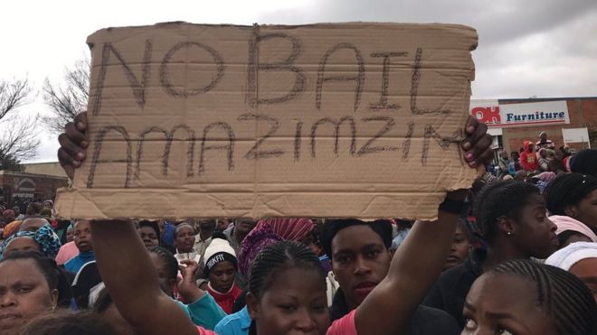 Baadhi ya walioandamana nje ya mahakama leo walikuwa na mabango na walikuwa wakiimba kwa Kizulu: "Tunataka kuwaona wauaji."